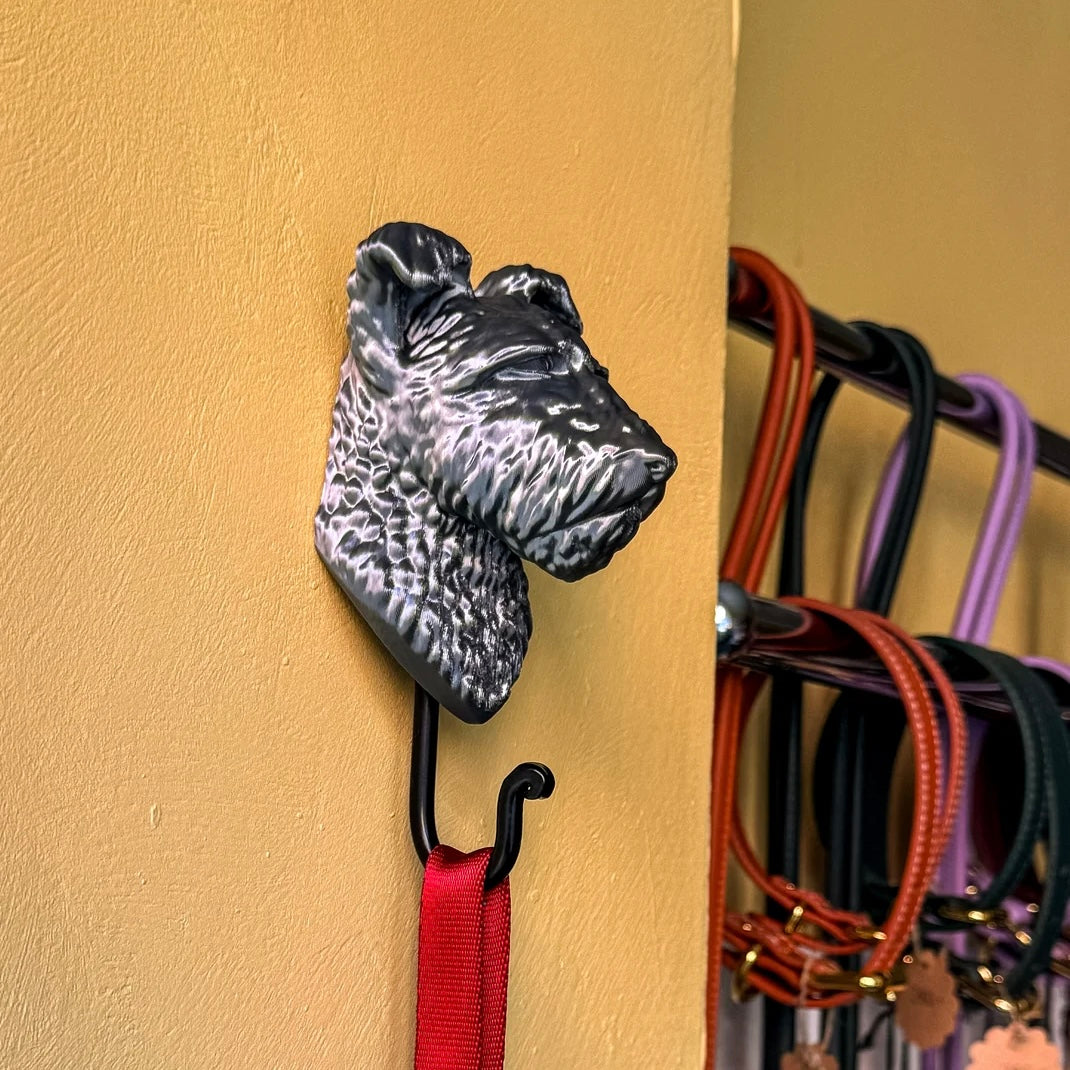 Beställ din personliga hundkrok modellerad utifrån två bilder på din hund en framifrån och en från sidan. Kroken skrivs ut i miljövänlig bioplast med integrerat fäste på baksidan. Med enkel eller dubbelkrok.