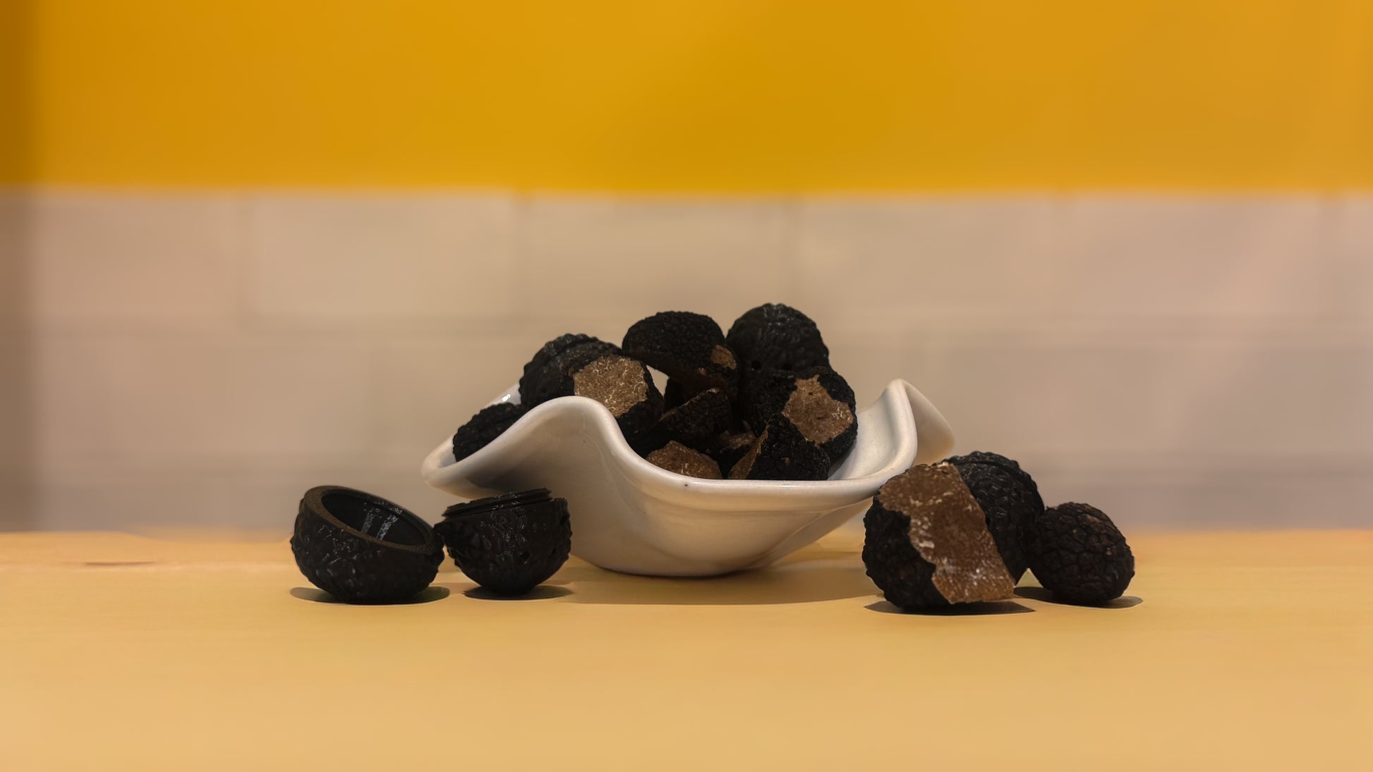Tryffeln är noggrant utformad efter den äkta Bourgognetryffeln (Tuber uncinatum), även kallad sommartryffel, som är en av våra mest uppskattade ädeltryfflar tack vare sin karakteristiska form och arom.