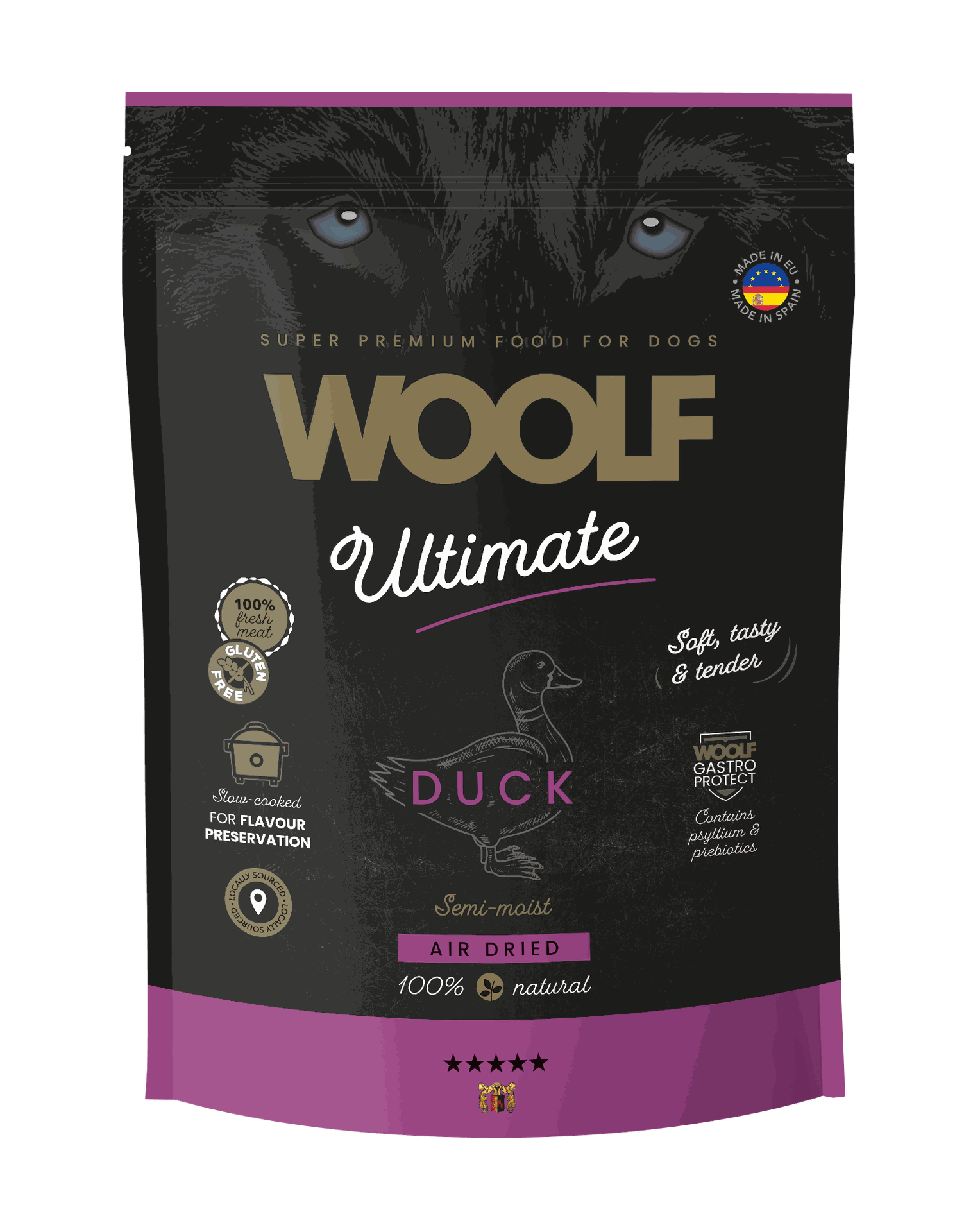 Woolf Ultimate Dogfood Duck är ett komplett och spannmålsfritt helfoder med anka som huvudprotein. Fodret består av 85 procent färskt kött i form av anka, kalkon och fisk, vilket ger hög smaklighet och en naturligt proteinrik måltid. Den halvfuktiga, mjuka konsistensen gör det extra lätt att tugga, något som uppskattas av både kräsna hundar, seniorer och valpar.
