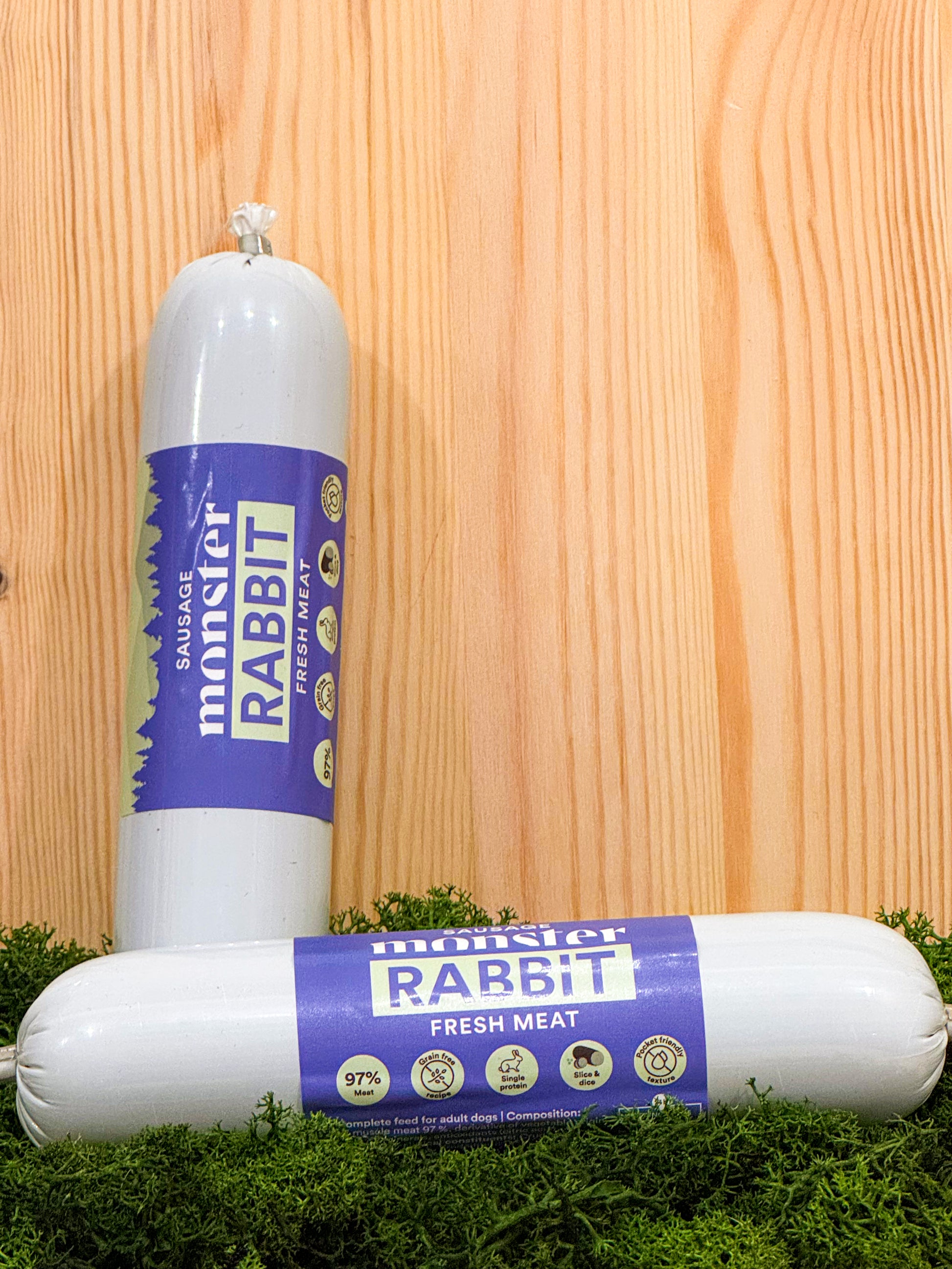 Monster Sausage Rabbit är smakrika korvar som passar utmärkt både som belöningsgodis och som helfoder till din hund. Korven har en mycket hög kötthalt på 97% och innehåller bara en proteinkälla, kanin, vilket underlättar för dig som har en känslig eller allergisk hund.