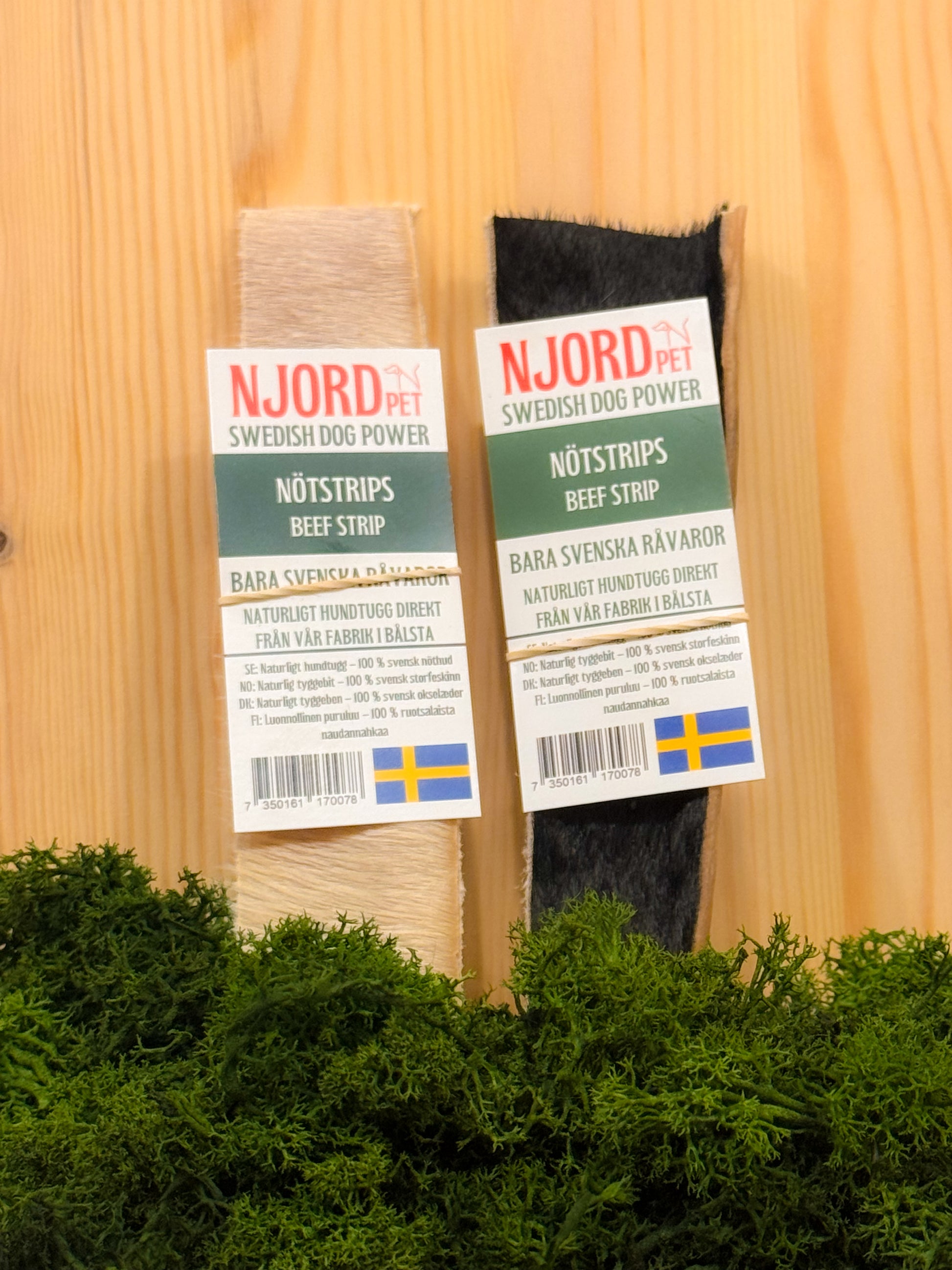 Njords Nötstrips är naturliga och handgjorda hundtugg, tillverkade av svensk kohud från lokala gårdar. Tugget är fritt från kemikalier och tillsatser, då hela huden inklusive narvhuden används, och håren behålls för extra smak och fibrer.