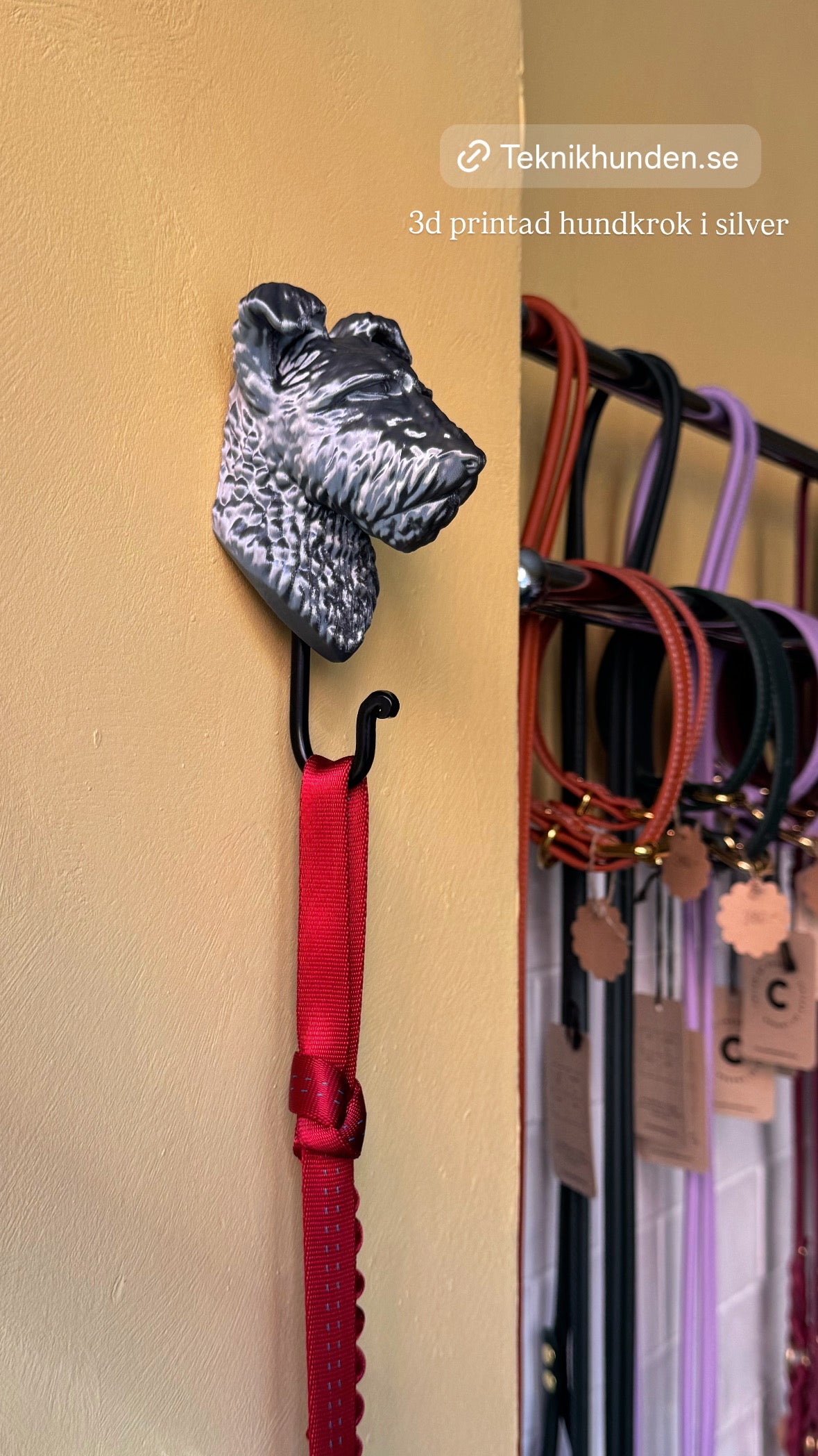 Beställ din personliga hundkrok modellerad utifrån två bilder på din hund – en framifrån och en från sidan. Kroken skrivs ut i miljövänlig bioplast med integrerat fäste på baksidan.