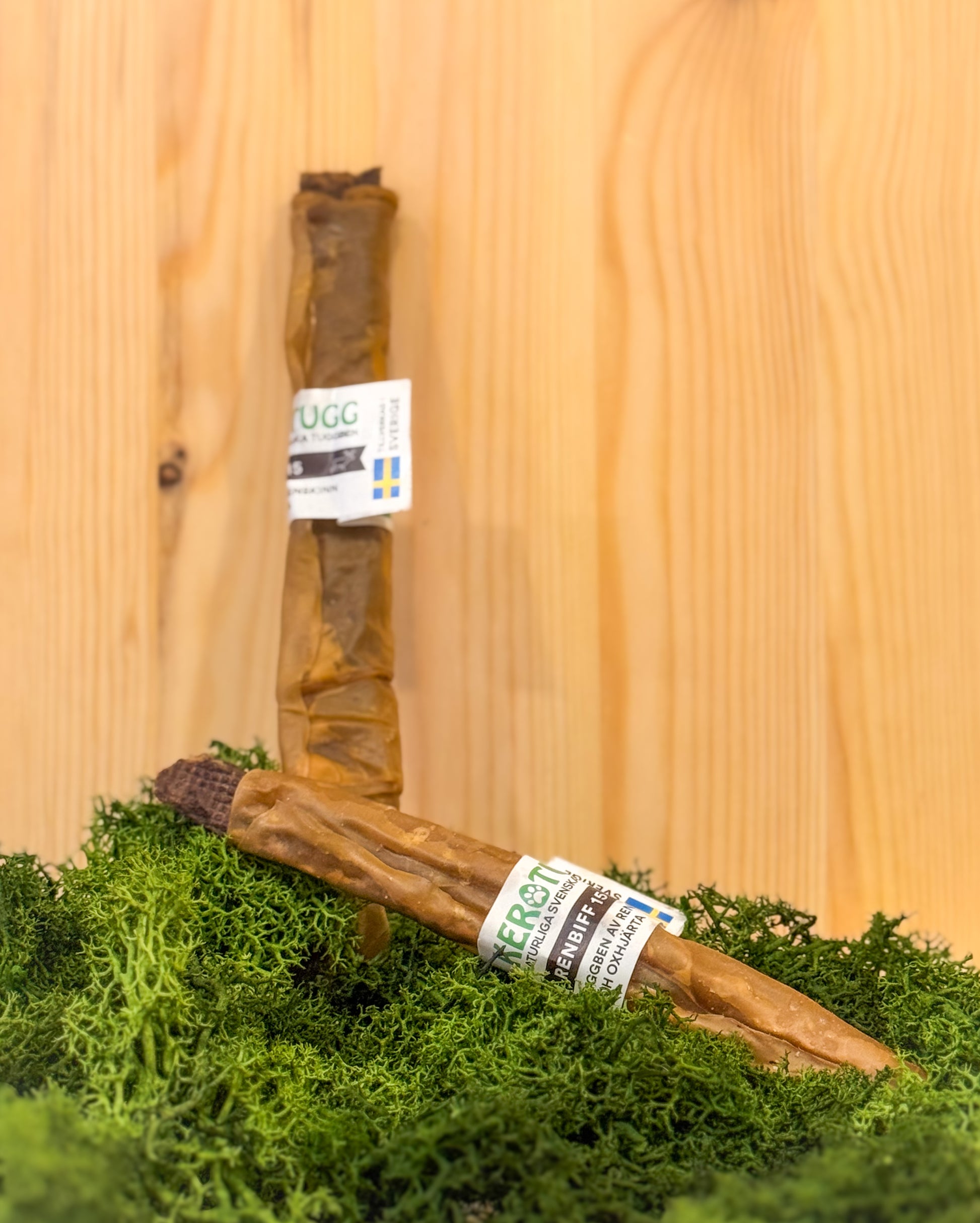 Ett tuggben tillverkat av renskinn och fyllning av torkat nötkött från Sverige.