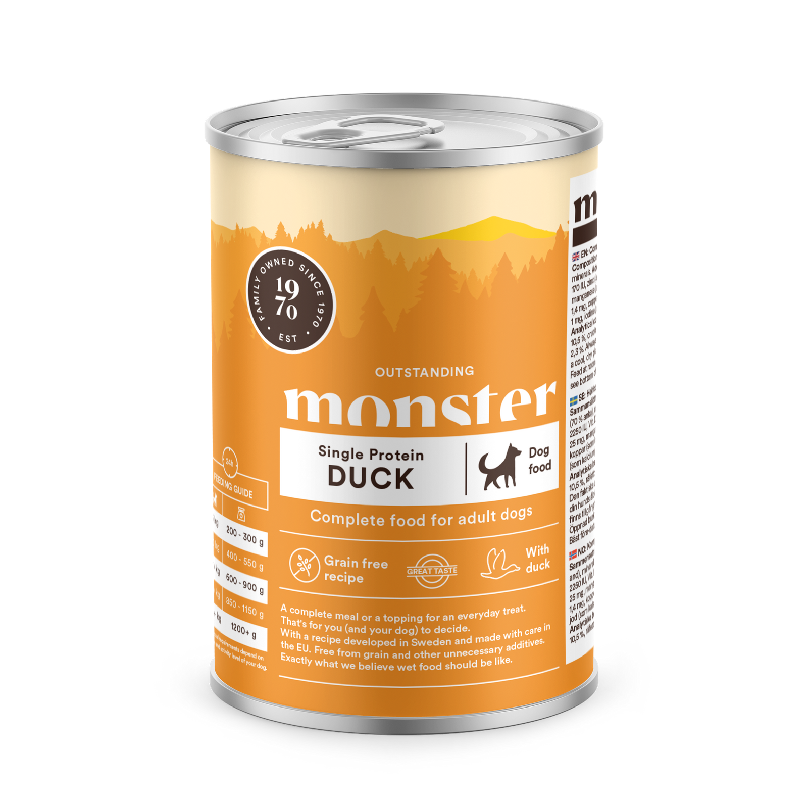 Komplett måltid eller bara lite guldkant på vardagen. Det bestämmer du (och din hund). Med recept framtaget i Sverige och omsorgsfullt tillagat i EU. Som är spannmålsfritt och utan andra onödiga tillsatser. Precis så som vi tycker att en blötmat ska vara. Med näringsrik anka.